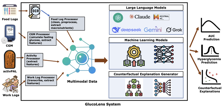 Postprandial hyperglycemia, marked by the blood glucose level exceeding the normal range after consuming a meal, is a critical indicator of progression toward type 2 diabetes in people with prediabetes and in healthy individuals. A key metric for understanding blood glucose dynamics after eating is the postprandial Area Under the Curve (AUC). Predicting postprandial AUC in advance based on a person’s lifestyle factors, such as diet and physical activity level, and explaining the factors that affect postprandial blood glucose could allow an individual to adjust their behavioral choices accordingly to maintain normal glucose levels. In this work, we develop an explainable machine learning solution, GlucoLens, that takes sensor-driven inputs and utilizes advanced data processing, large language models, and trainable machine learning models to estimate postprandial AUC and predict hyperglycemia from diet, physical activity, and recent glucose patterns. We use data obtained using wearables in a five-week clinical trial of 10 adults who worked full-time to develop and evaluate the proposed computational model that integrates wearable sensing, multimodal data, and machine learning. Our machine learning model takes multimodal data from wearable activity and glucose monitoring sensors, along with food and work logs, and provides an interpretable prediction of the postprandial glucose patterns. GlucoLens achieves a normalized root mean squared error (NRMSE) of 0.123 in its best configuration. On average, the proposed technology provides a 16% better predictive performance compared to the comparison models. Additionally, our technique predicts hyperglycemia with an accuracy of 79% and an F1 score of 0.749 and recommends different treatment options to help avoid hyperglycemia through diverse counterfactual explanations. With systematic experiments and discussion supported by established prior research, we show that our method is generalizable and consistent with clinical understanding.